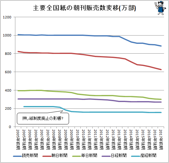 2001年上半期と16年上半期の新聞販売データを比べてみると、読売新聞が1,028万部から901万部、朝日新聞が832万部から658万部、毎日新聞が396万部から309万部と、大きく部数を下げている。